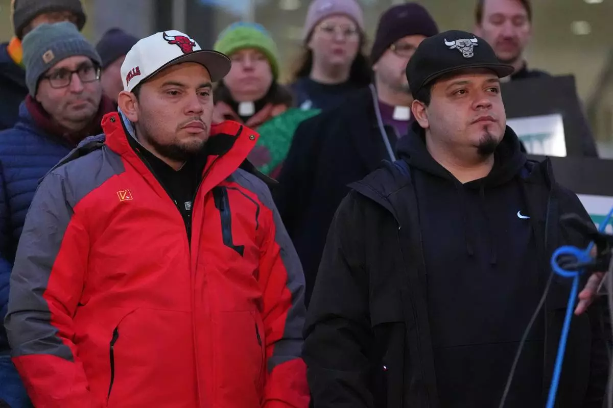 Kilmar Abrego Garcia listens with is brother Cesar Abrego Garcia during a rally ahead of a mandatory check at the Immigration and Customs Enforcement office in Baltimore, Friday, Dec. 12, 2025, after he was released from detention on Thursday under a judge's order. (AP Photo/Stephanie Scarbrough)