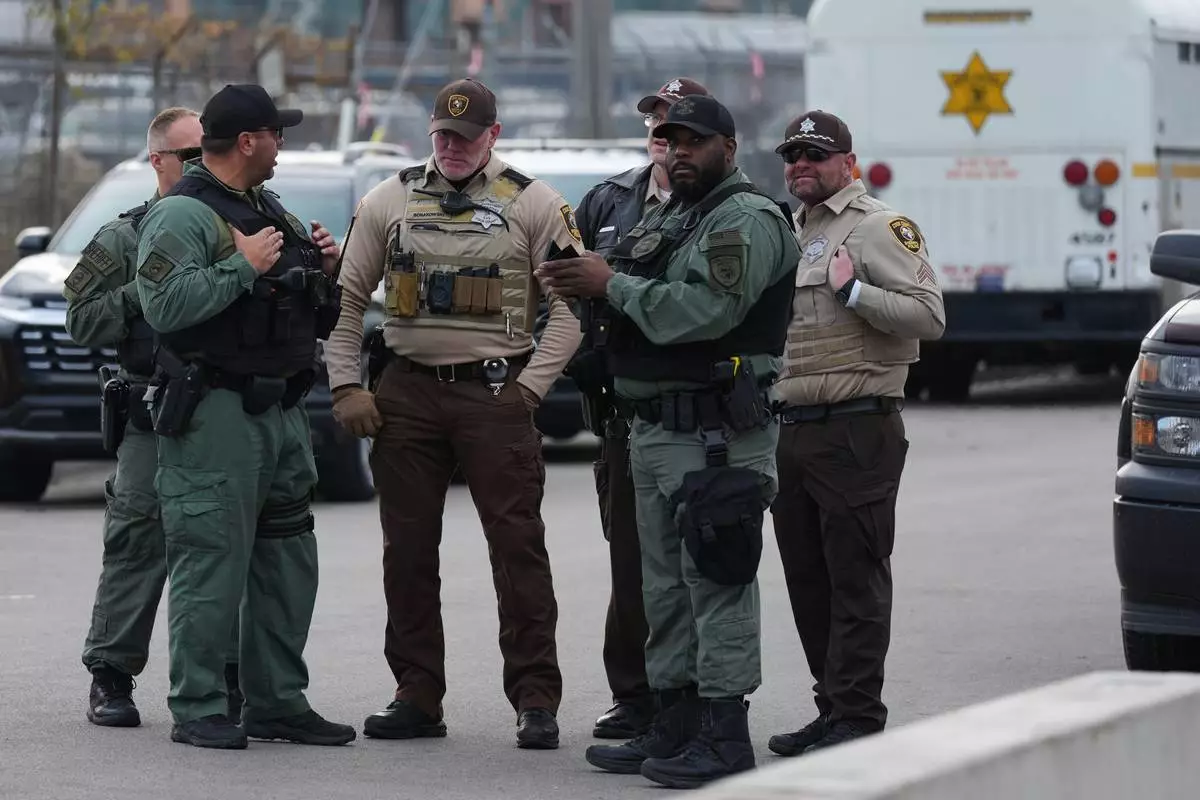 FILE - Law enforcement officers guard outside an ICE processing facility in the Chicago suburb of Broadview, Ill., on Nov. 21, 2025. (AP Photo/Nam Y. Huh, File)