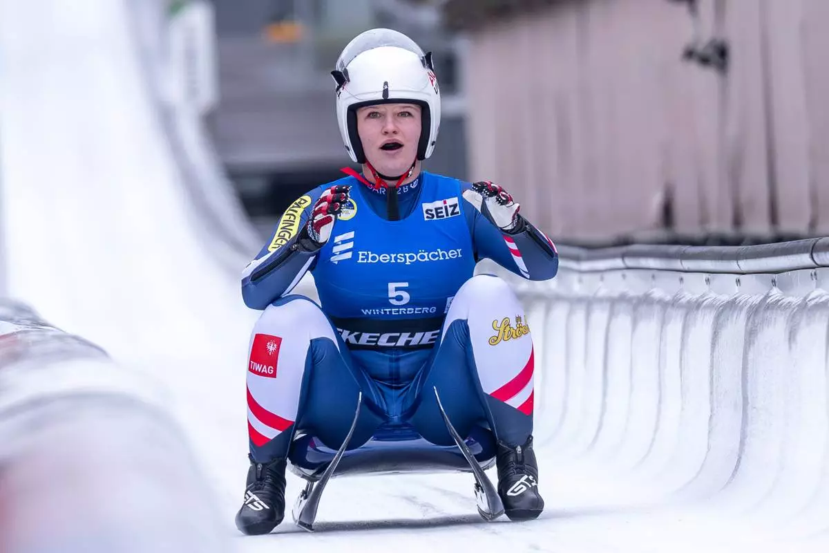 First placed Austria's Hannah Prock reacts after the women's single-seater Luge World Cup race in Winterberg, Germany, Sunday, Dec. 7, 2025. (David Inderlied/dpa via AP)