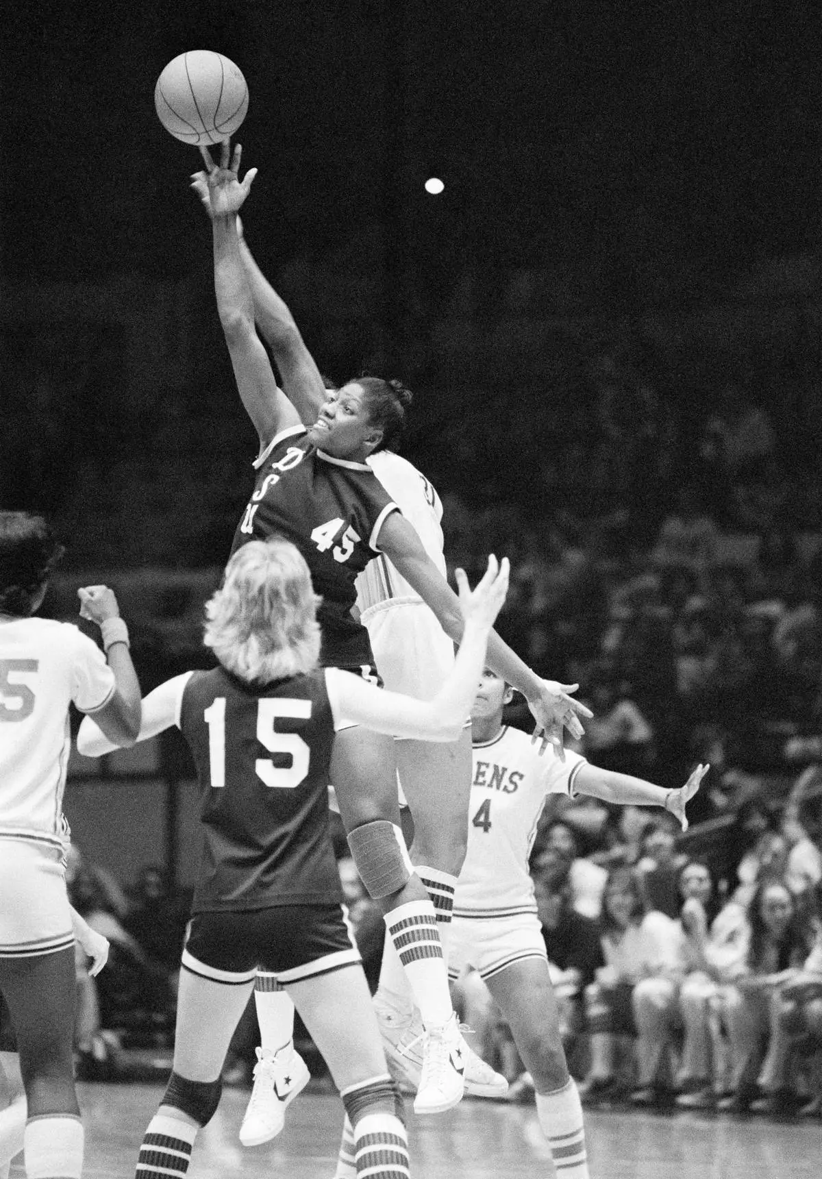 FILE - Delta State University's Lusia Harris (45) gets off a shot against Queens College during a women's college basketball game at Madison Square Garden in New York, Feb. 23, 1976. (AP Photo/Ron Frehm, File)