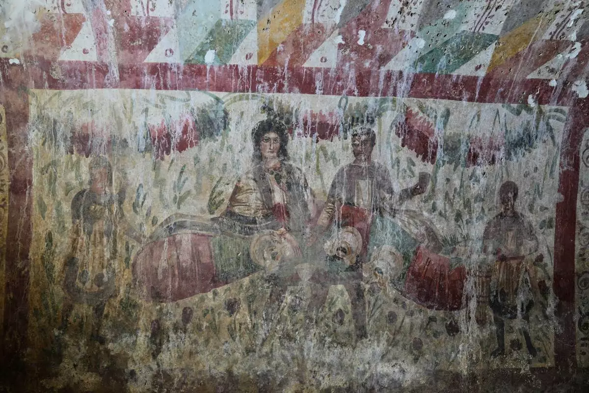 A Roman-era fresco depicting a banquet scene is seen inside a newly uncovered tomb in Hisardere, in Iznik in northwestern Turkey, Friday, Dec. 12, 2025. (AP Photo/Khalil Hamra)