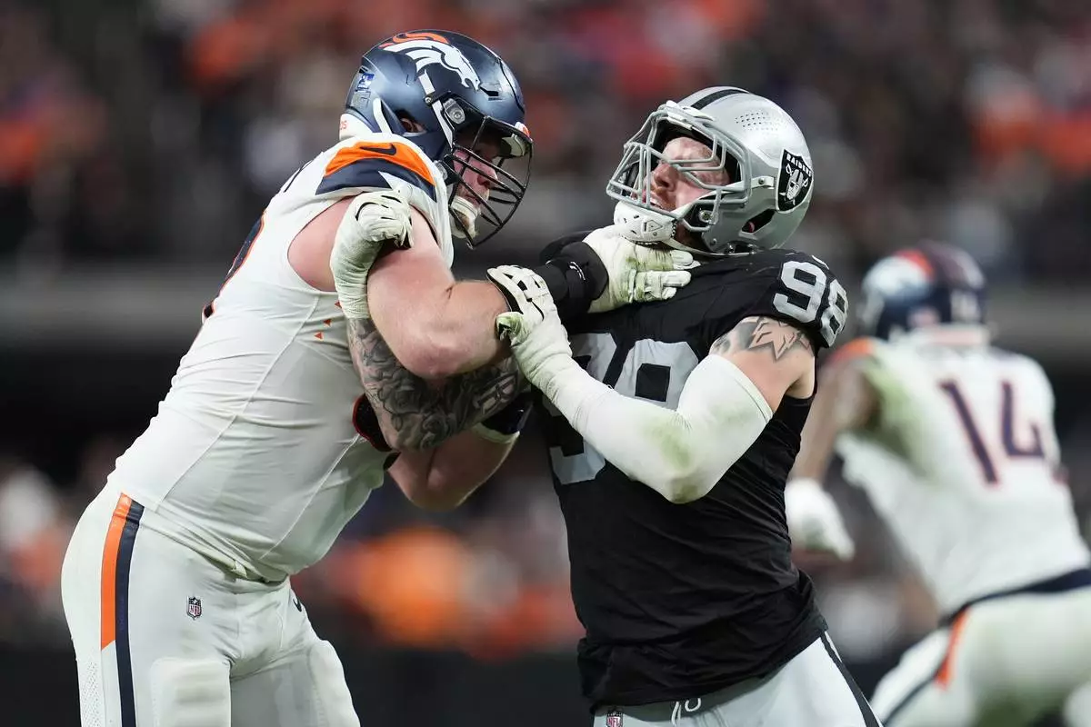 Denver Broncos offensive tackle Garett Bolles, left, blocks Las Vegas Raiders defensive end Maxx Crosby during the second half of an NFL football game in Las Vegas, Sunday, Dec. 7, 2025. (AP Photo/Gregory Bull)
