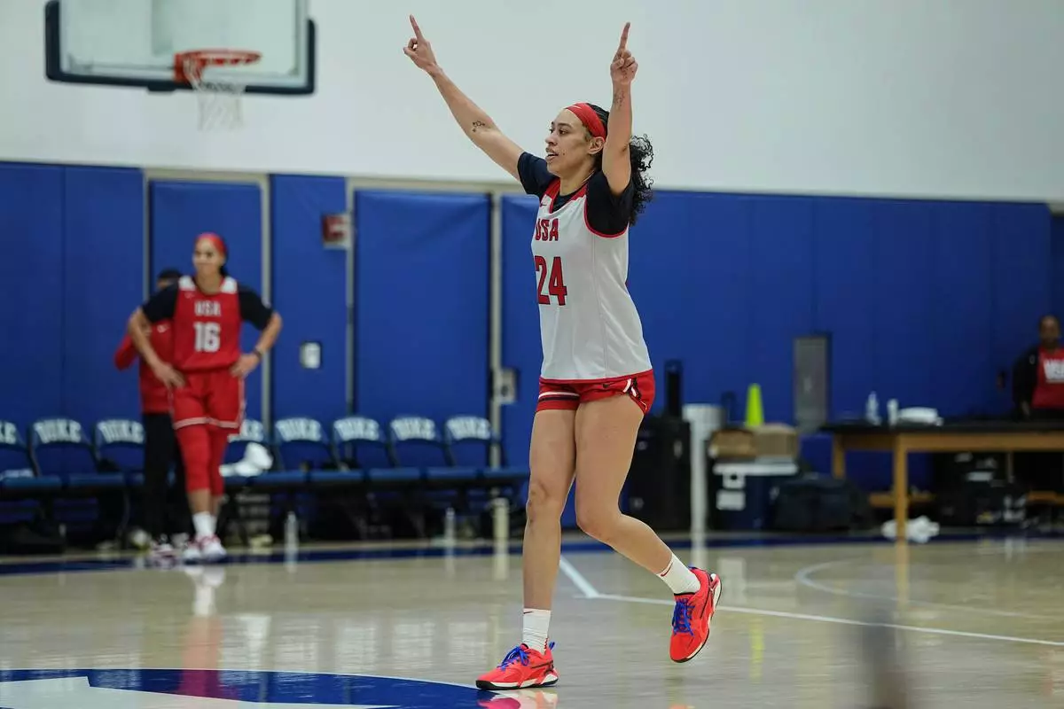 Dearica Hamby (24) reacts during a training camp for the U.S women's national basketball team, Friday, Dec. 12, 2025, in Durham, N.C. (AP Photo/Matt Kelley)