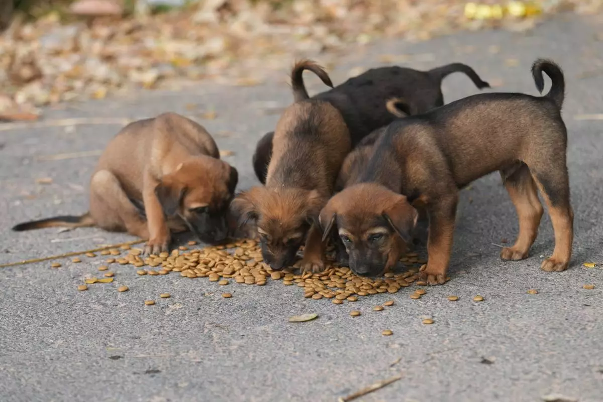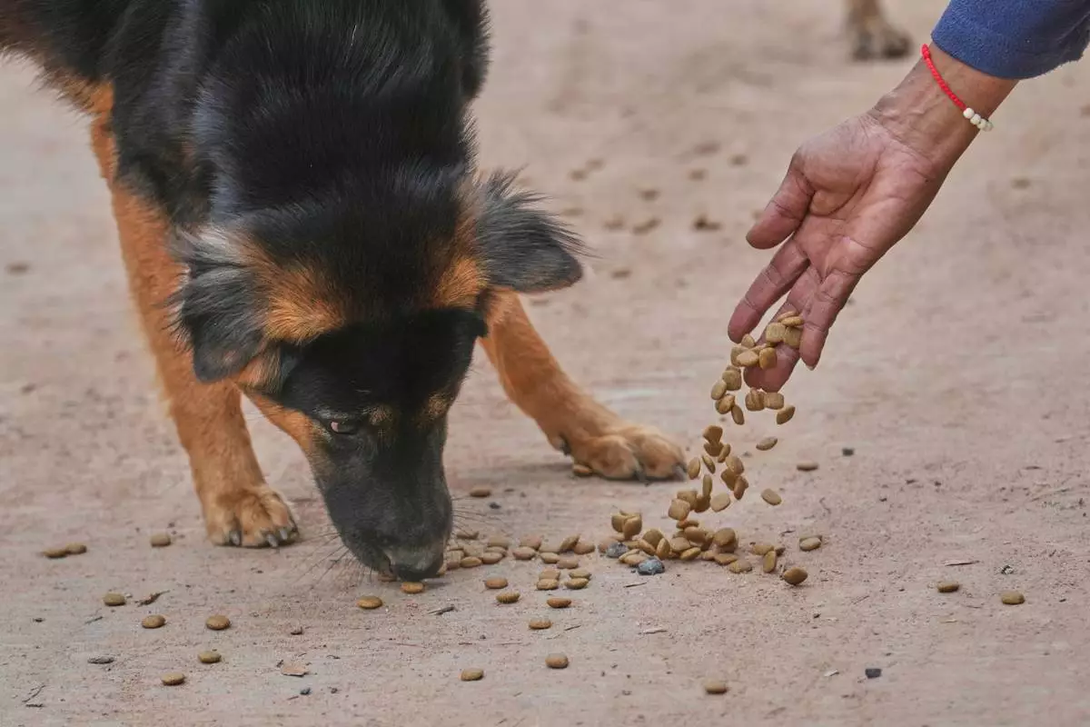 Stray dogs are given food by a village security volunteer in the community while villagers have moved to an evacuation center amid the ongoing border conflict between Thailand and Cambodia, in Buriram province, Thailand, Friday, Dec. 12, 2025. (AP Photo/Sakchai Lalit)