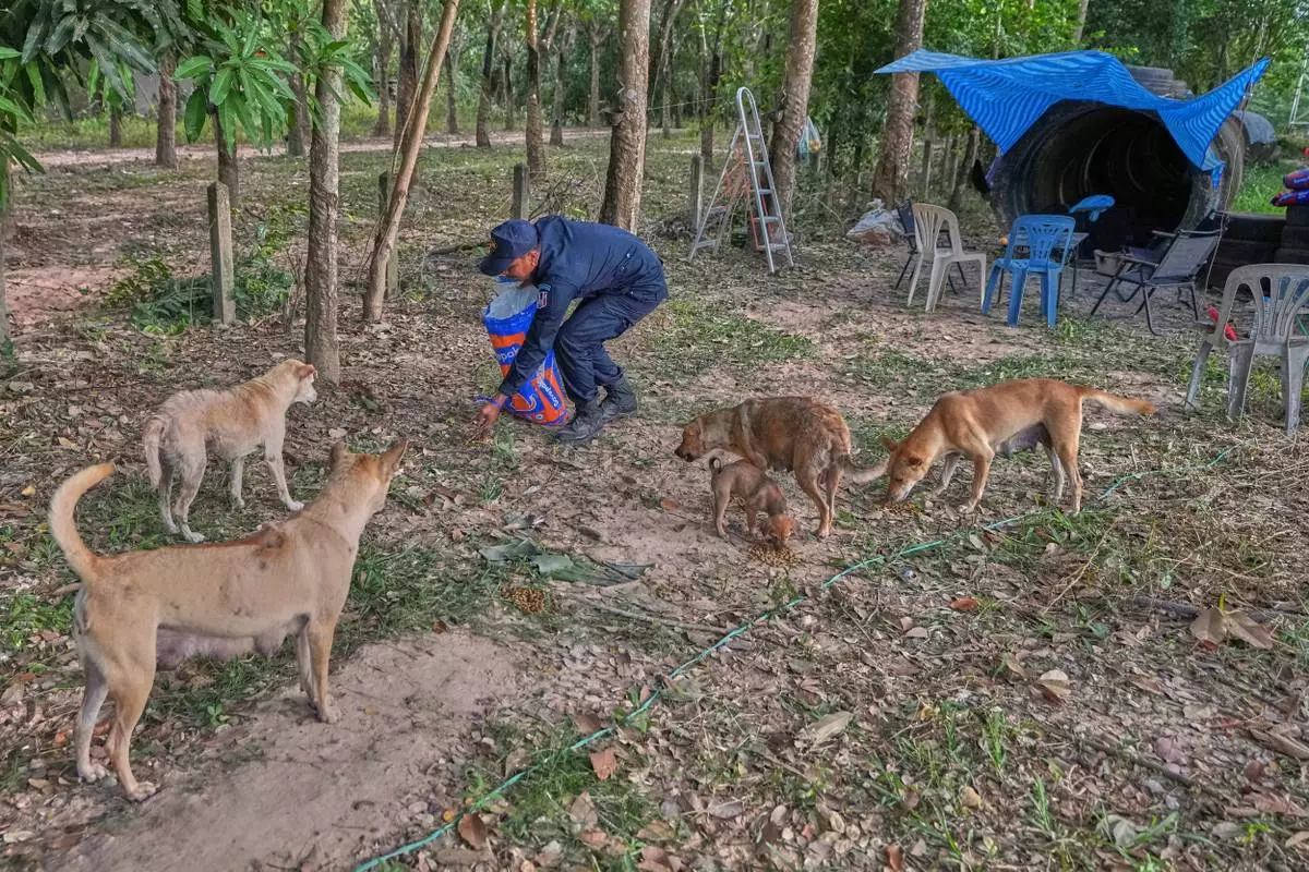Somjai said the volunteer team performs all these duties, keeping close watch on strangers and patrolling at night to discourage thieves from entering abandoned homes. Her main responsibility, however, is not monitoring threats but caring for about 70 dogs left behind in the community.