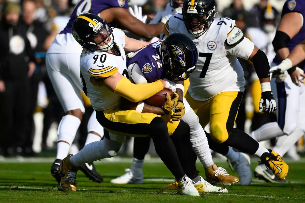 Pittsburgh Steelers linebacker Alex Highsmith (56) and linebacker Nick Herbig (51) tackle Baltimore Ravens quarterback Lamar Jackson (8) during the second half of an NFL football game, Sunday, Dec. 7, 2025, in Baltimore. (AP Photo/Stephanie Scarbrough)
