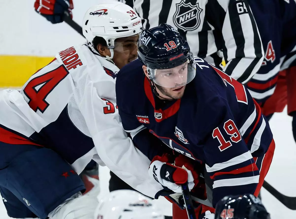 Winnipeg Jets' Jonathan Toews (19) and Washington Capitals' Justin Sourdif (34) battle for position during the first period of an NHL game in Winnipeg on Saturday, Dec. 13, 2025. (John Woods/The Canadian Press via AP)