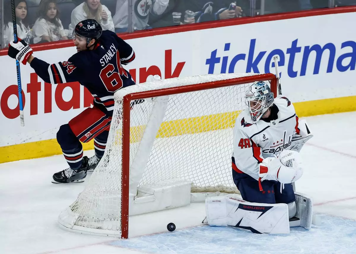 Winnipeg Jets' Logan Stanley (64) scores on Washington Capitals goaltender Logan Thompson (48) during the first period of an NHL game in Winnipeg on Saturday, Dec. 13, 2025. (John Woods/The Canadian Press via AP)