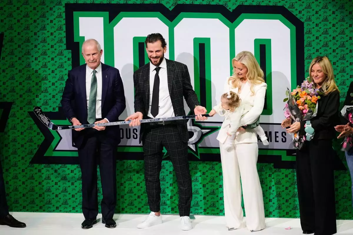Dallas Stars General Manager is Jim Nill, left, presents Tyler Seguin, center, with a 1000-game trophy stick as he wife Kate, and child look on before an NHL hockey game agianst the Florida Panthers in Dallas, Saturday, Dec. 13, 2025. (AP Photo/Tony Gutierrez)