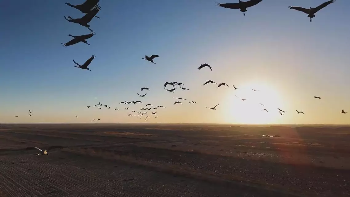 Over 5,000 gray cranes have settled in the winter fields of Tiemenguan, located on the edge of the Taklimakan Desert in China's Xinjiang Uygur Autonomous Region, adding a vibrant touch of life to the desert's outskirts.
