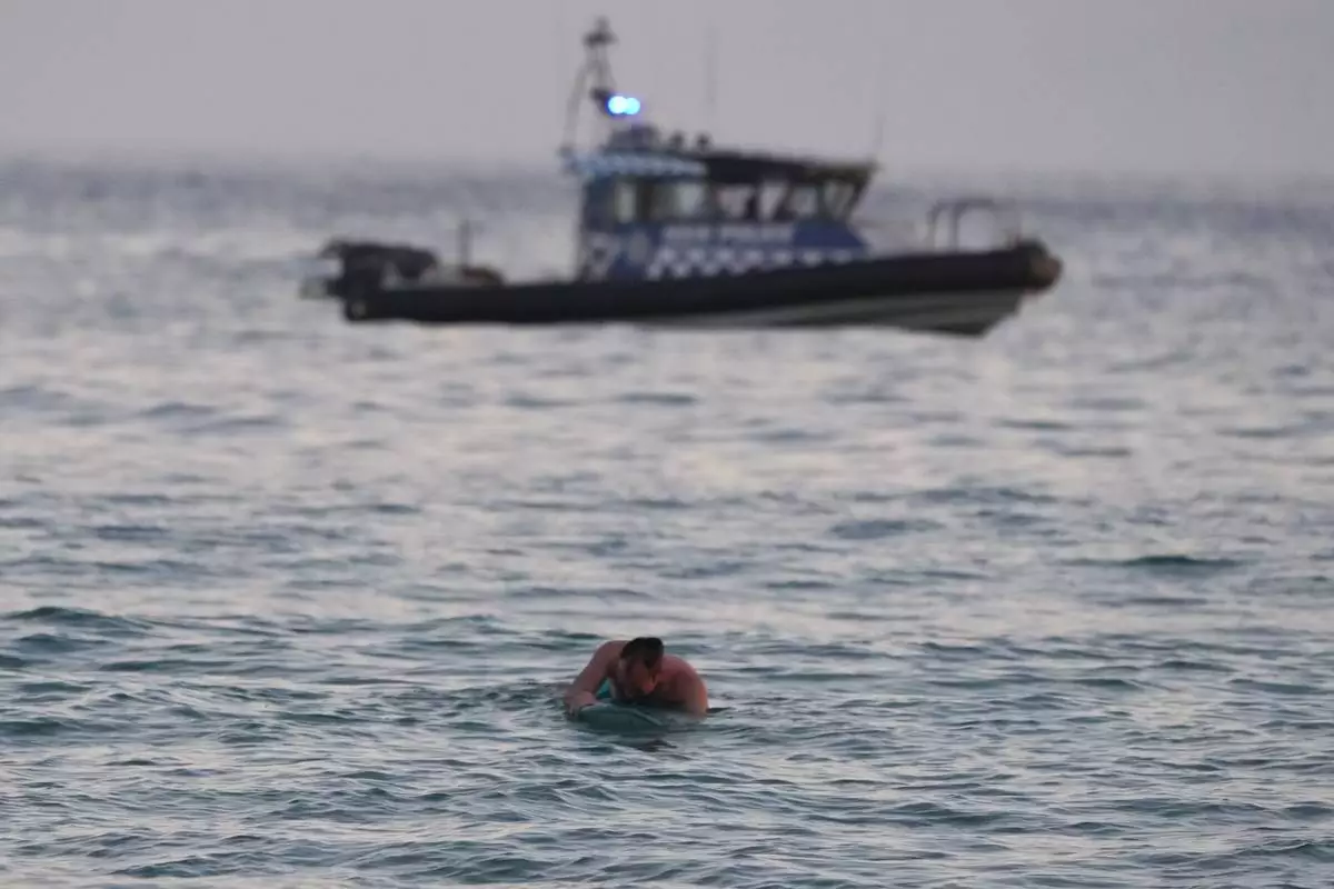A surfer paddles back to shore as a police boat patrols the water after a reported shooting at Bondi Beach in Sydney, Sunday, Dec. 14, 2025. (AP Photo/Mark Baker)