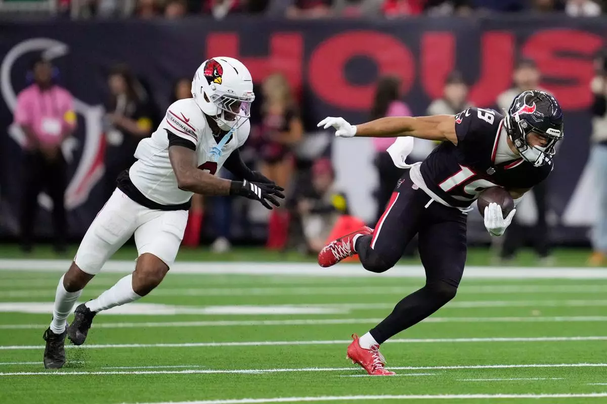 Houston Texans wide receiver Xavier Hutchinson (19) runs past Arizona Cardinals cornerback Will Johnson during the first half of an NFL football game Sunday, Dec. 14, 2025, in Houston. (AP Photo/Ashley Landis)