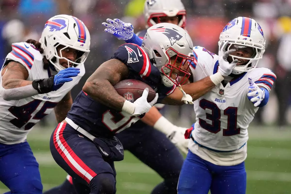New England Patriots running back Treveyon Henderson, middle, stiff arms Buffalo Bills cornerback Maxwell Hairston (31) during the first half of an NFL football game in Foxborough, Mass., Sunday, Dec. 14, 2025. (AP Photo/Charles Krupa)
