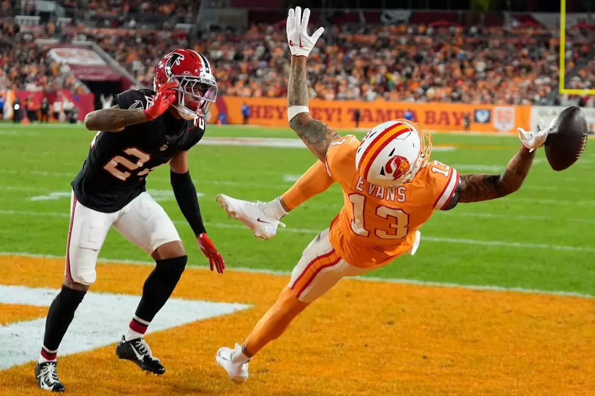 Tampa Bay Buccaneers wide receiver Mike Evans (13) misses the catch Atlanta Falcons cornerback A.J. Terrell Jr. (24) during the first half of an NFL football game, Thursday, Dec. 11, 2025, in Tampa, Fla. (AP Photo/Chris O'Meara)