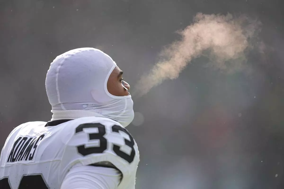 Las Vegas Raiders linebacker Jamal Adams warms up before an NFL football game against the Philadelphia Eagles on Sunday, Dec. 14, 2025, in Philadelphia. (AP Photo/Matt Rourke)