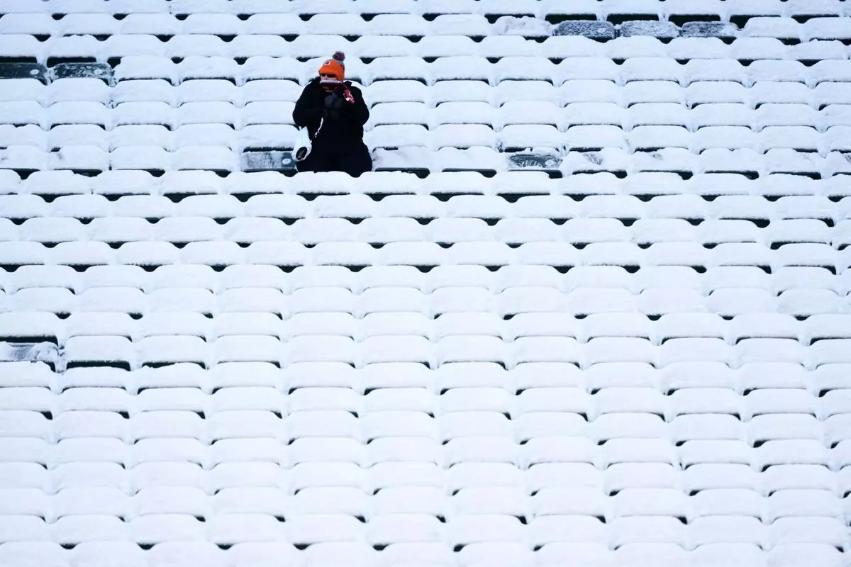 A fan sits in the stadium seats covered in snow before an NFL football game between the Cincinnati Bengals and the Baltimore Ravens, Sunday, Dec. 14, 2025, in Cincinnati. (AP Photo/Carolyn Kaster)