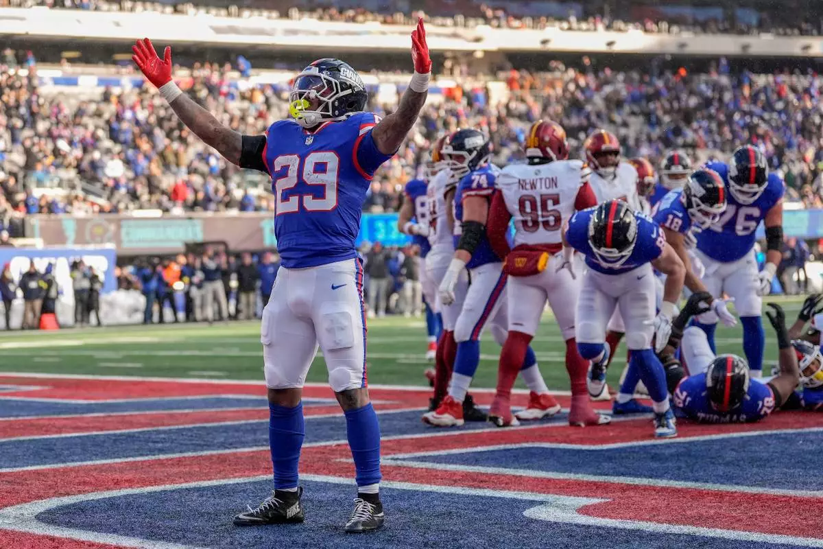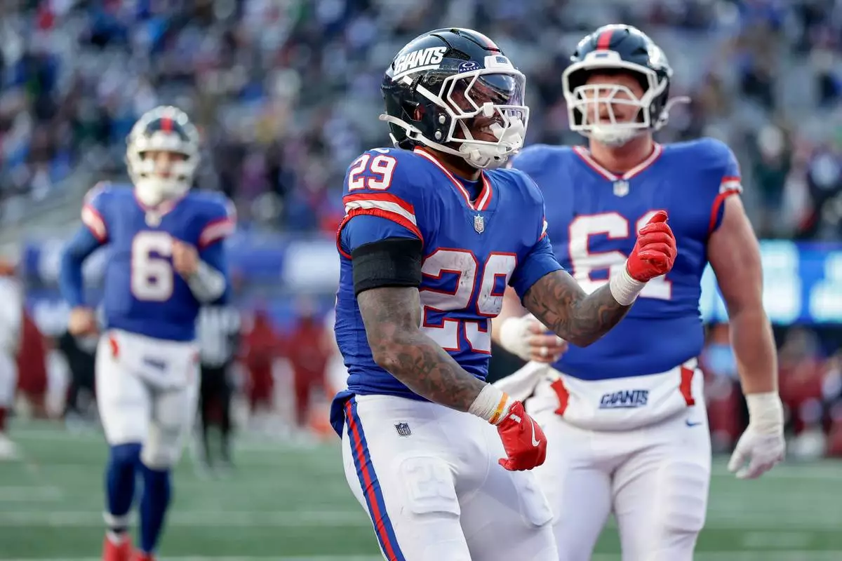 New York Giants running back Tyrone Tracy Jr. (29) reacts after scoring a touchdown against the Washington Commanders during the second quarter of an NFL football game, Sunday, Dec. 14, 2025, in East Rutherford, N.J. (AP Photo/Yuki Iwamura)
