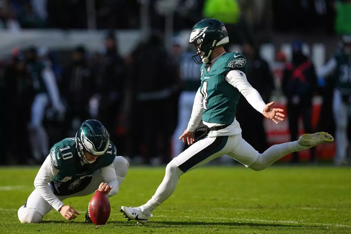 Philadelphia Eagles' Jake Elliott kicks for an extra point during the first half of an NFL football game against the Las Vegas Raiders on Sunday, Dec. 14, 2025, in Philadelphia. (AP Photo/Matt Rourke)