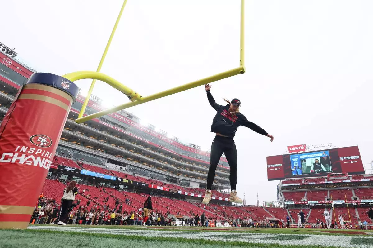 San Francisco 49ers tight end George Kittle jumps to touch the goalpost before an NFL football game against the Tennessee Titans, Sunday, Dec. 14, 2025, in Santa Clara, Calif. (AP Photo/Jed Jacobsohn)