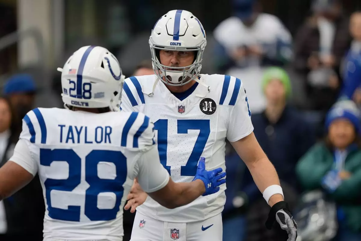 Indianapolis Colts quarterback Philip Rivers (17) greets running back Jonathan Taylor (28) before an NFL football game against the Seattle Seahawks, Sunday, Dec. 14, 2025, in Seattle. (AP Photo/Stephen Brashear)
