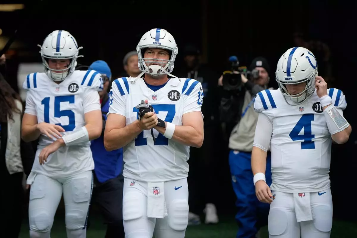 Indianapolis Colts quarterback Philip Rivers (17) walks on to the field with teammates Riley Leonard (15) and Brett Rypien (4) before an NFL football game against the Seattle Seahawks, Sunday, Dec. 14, 2025, in Seattle. (AP Photo/Stephen Brashear)
