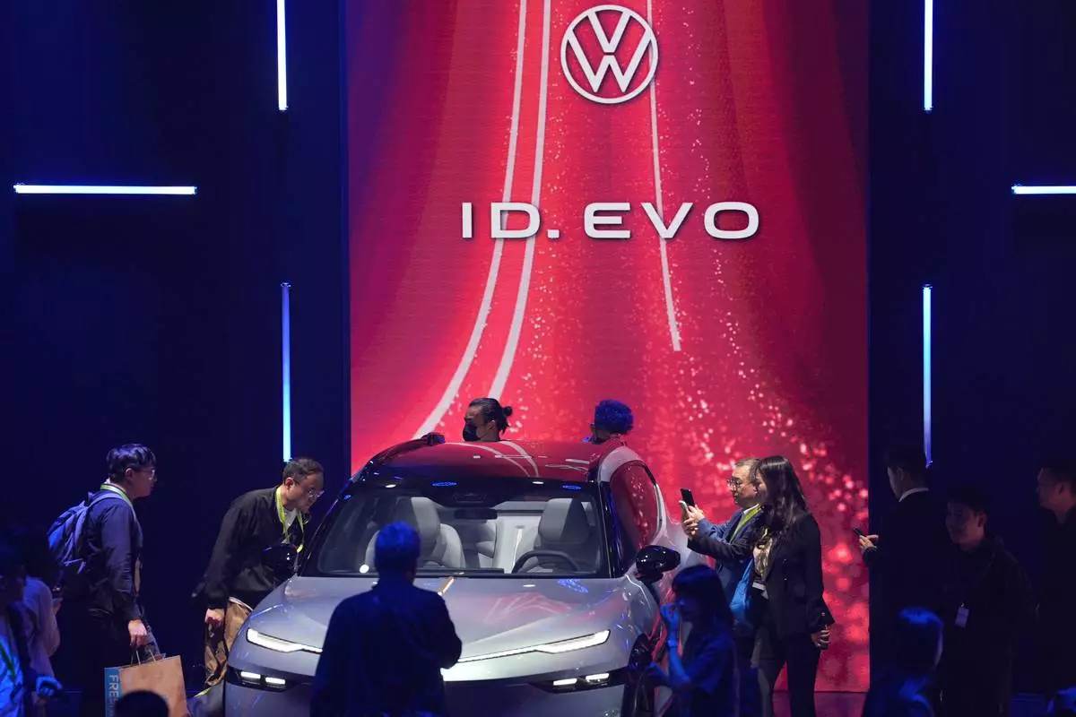 Attendees look at the ID.EVO concept car during the Volkswagen Group media night ahead of the Auto Show in Shanghai, April 22, 2025. (AP Photo/Ng Han Guan)