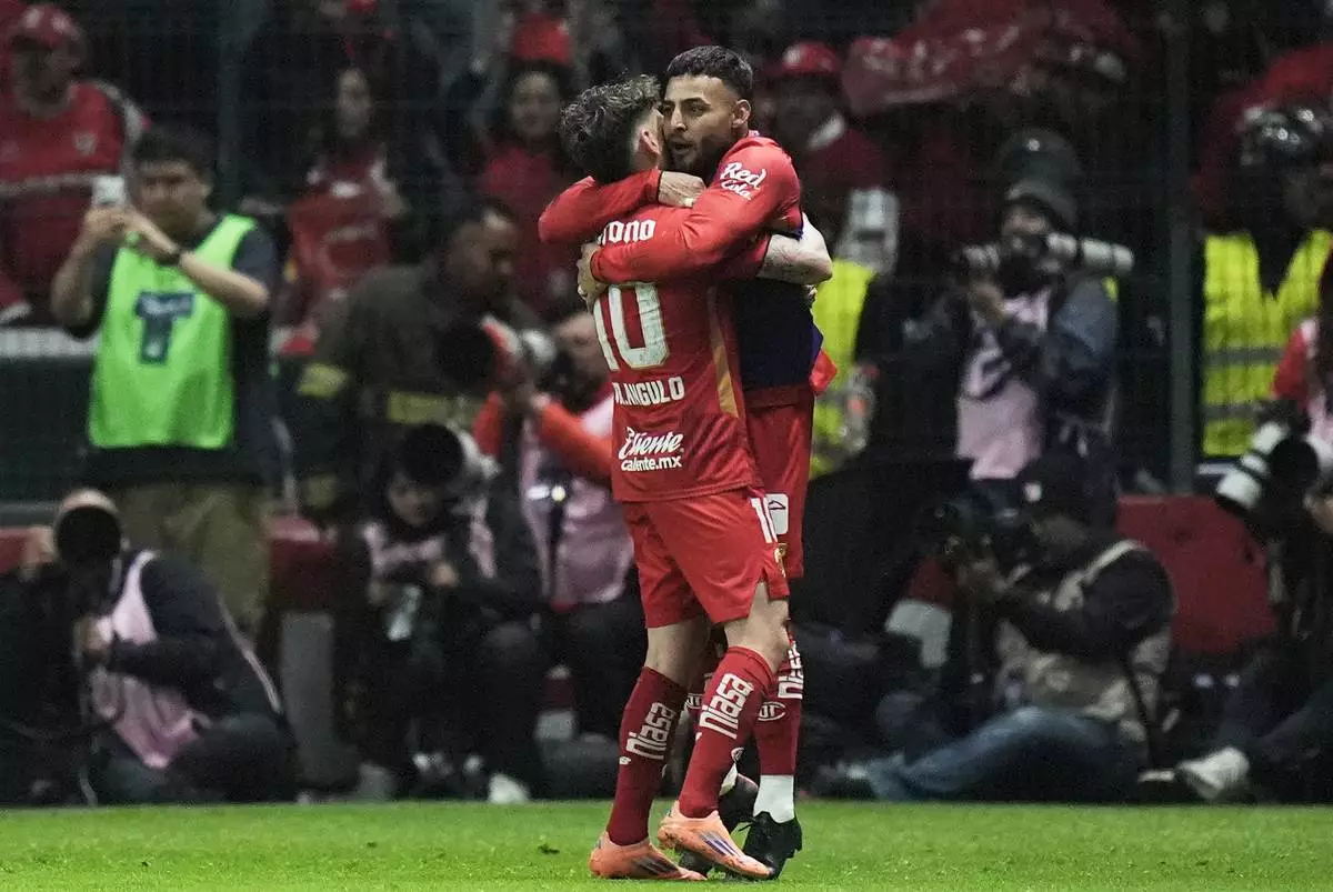Toluca's Jesus Angulo, left, and Alexis Vega celebrate their side's second goal scored by Paulinho against Tigres during the Mexican soccer league second leg final match in Toluca, Mexico, Sunday, Dec. 14, 2025. (AP Photo/Eduardo Verdugo)