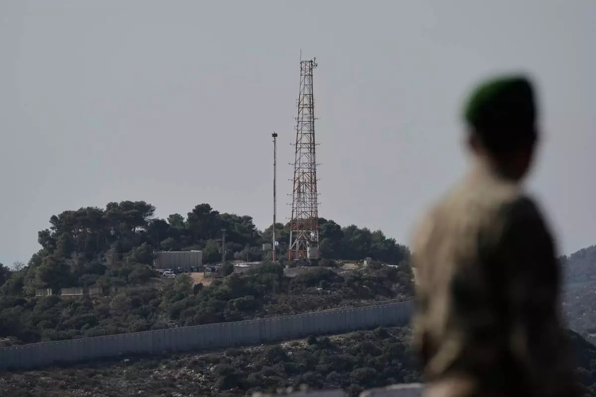 FILE - A Lebanese army soldier looks at the Israeli military post of Hanita from the Alma al-Shaab border village with Israel, south Lebanon, southern Lebanon, Nov. 28, 2025. (AP Photo/Bilal Hussein, File)