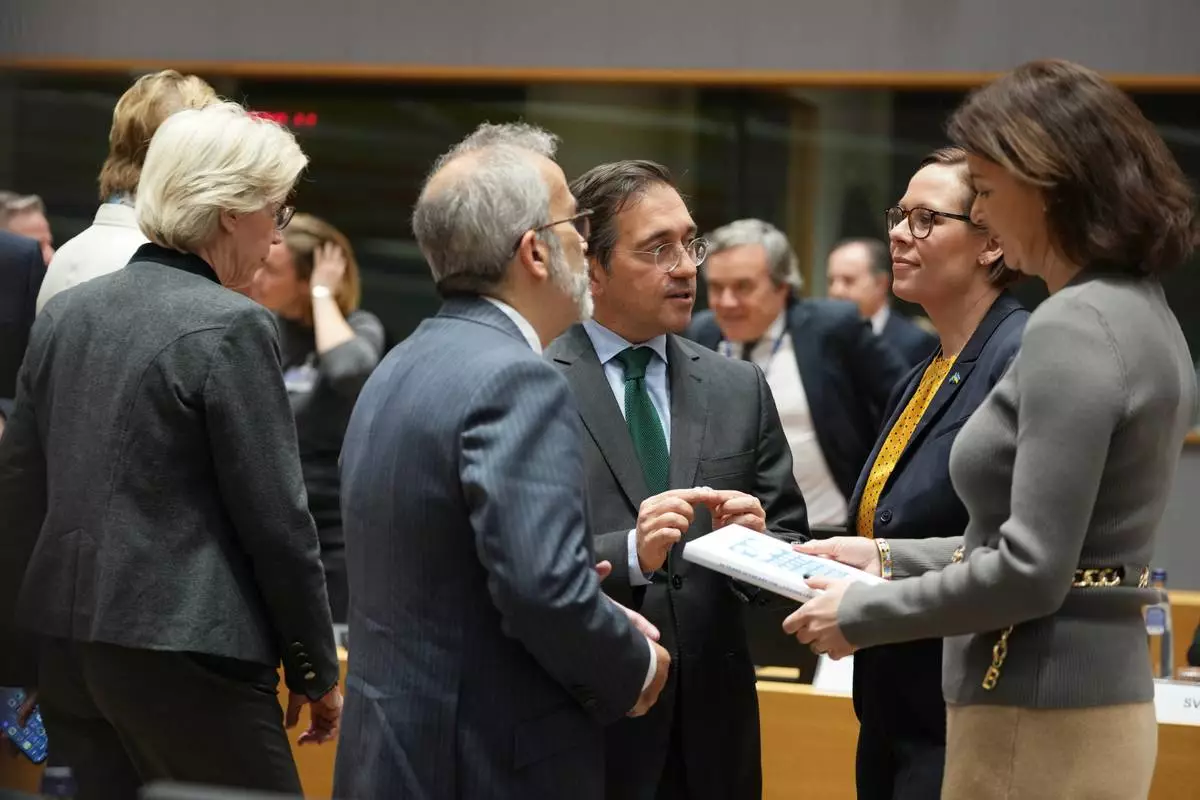 From right, Slovenia's Foreign Minister Tanja Fajon, Sweden's Foreign Minister Maria Malmer Stenergard, Spain's Foreign Minister Jose Manuel Albares Bueno and Portugal's Foreign Minister Paulo Rangel speak during a meeting of EU foreign ministers at the European Council building in Brussels, Monday, Dec. 15, 2025. (AP Photo/Virginia Mayo)