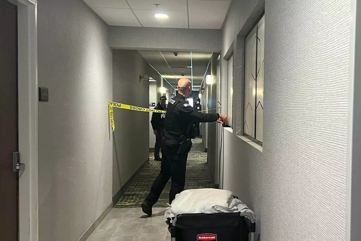 Police tape off hotel rooms where the person of interest was arrested in a shooting, Sunday, Dec. 14, 2025, in Coventry, R.I. (AP Photo/Kimberlee Kruesi)