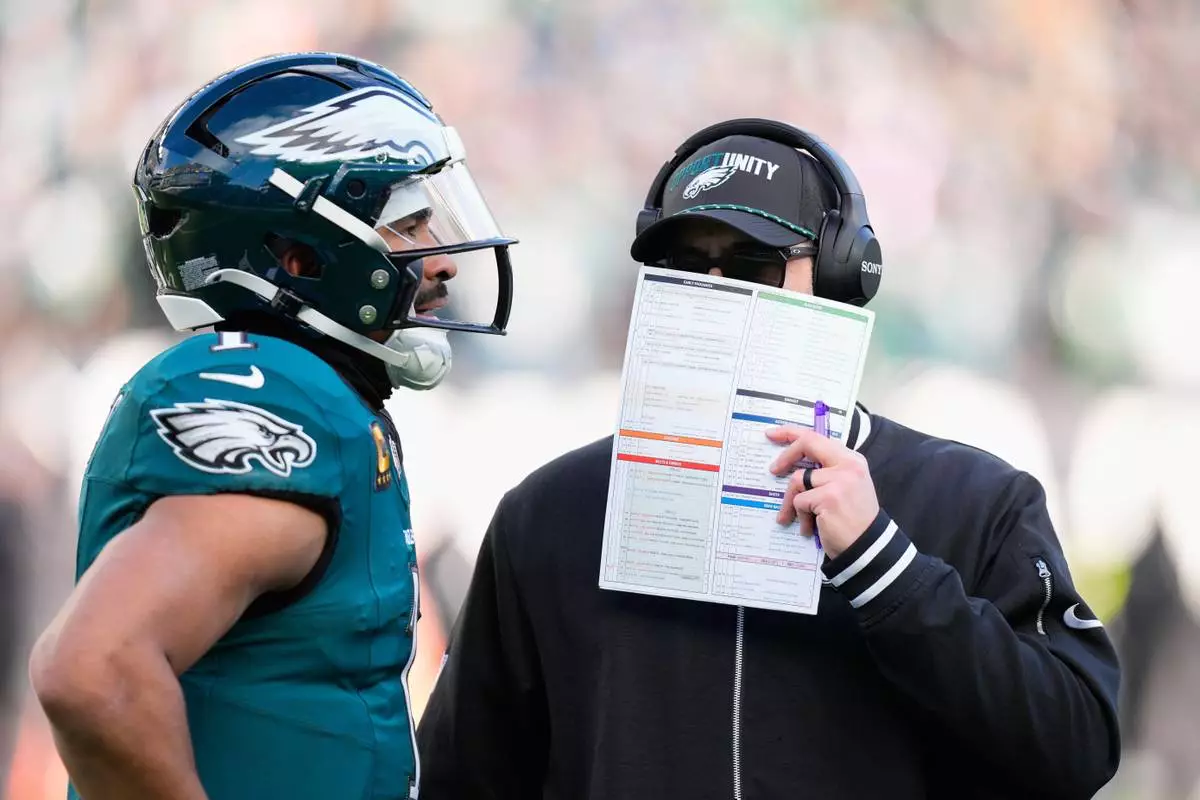 Philadelphia Eagles quarterback Jalen Hurts (1) talks to Eagles' Kevin Patullo during the first half of an NFL football game against the Las Vegas Raiders on Sunday, Dec. 14, 2025, in Philadelphia. (AP Photo/Chris Szagola)