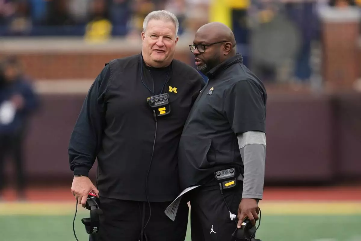 FILE - Michigan associate head coach Biff Poggi, left, talks with running backs coach Tony Alford talk during an NCAA college football spring game in Ann Arbor, Mich., Saturday, April 19, 2025. (AP Photo/Paul Sancya, File)