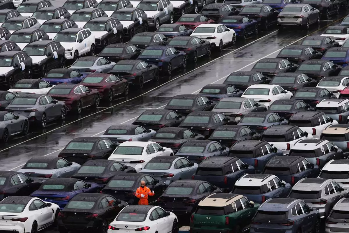 FILE - A worker checks on new cars parked in a lot at the International Car Operators terminal in the Port of Zeebrugge, Belgium, July 31, 2025. (AP Photo/Virginia Mayo, File)