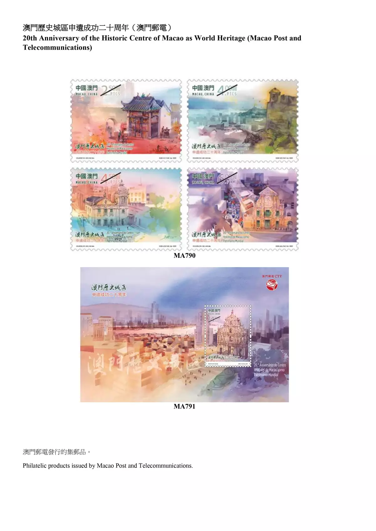 To mark the 20th anniversary of the inscription of the city's historic centre onto the World Heritage List, Macao Post and Telecommunications issued a set of stamps themed on the "20th Anniversary of the Historic Centre of Macao as World Heritage". The stamp set illustrates a number of invaluable architectural landmarks within the Historic Centre of Macao. While the four stamps depict Na Tcha Temple (next to the Ruins of St. Paul's College), Mount Fortress, St. Anthony's Church and forecourt, and St. Dominic's Church, the stamp sheetlet features the Ruins of St. Paul's College (former Mater Dei Church, forecourt and staircase). Macao Post and Telecommunications also issued a set of stamps on the theme of "Rare Animals in China". Themed on nationally protected wildlife, this stamp issue aims to awaken public concern for endangered species.