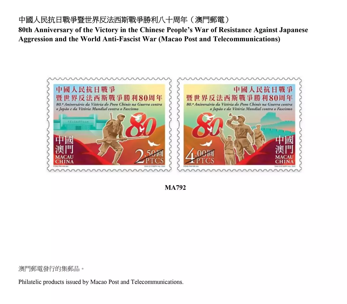 Macao Post and Telecommunications also issued stamps on the theme of the "80th Anniversary of the Victory in the Chinese People's War of Resistance Against Japanese Aggression and the World Anti-Fascist War". This issue comprises a set of two stamps that showcase the determination of the Chinese military and civilians during the war. The soldiers, heads held high and chests thrust out, march fearlessly towards peace, facing the bright direction in which the white doves fly. Featuring the Museum of the War of Chinese People's Resistance Against Japanese Aggression and the Great Wall in the backgrounds, the stamps commemorate the immortal contributions of the valiant anti-Japanese soldiers who sacrificed their lives for the nation and highlight their unwavering determination to defend the homeland.