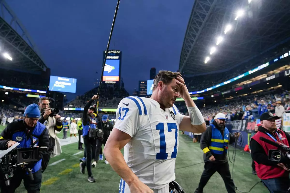 Indianapolis Colts quarterback Philip Rivers (17) leaves the field after an NFL football game against the Seattle Seahawks, Sunday, Dec. 14, 2025, in Seattle. (AP Photo/Stephen Brashear)