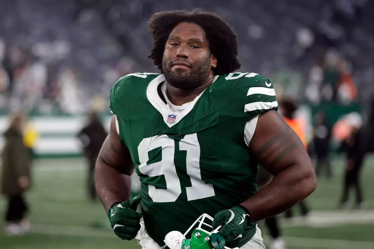 FILE - New York Jets defensive tackle Jowon Briggs (91) after an NFL football game against the Cleveland Browns, Sunday, Nov. 9, 2025, in East Rutherford, N.J. (AP Photo/Adam Hunger,File)