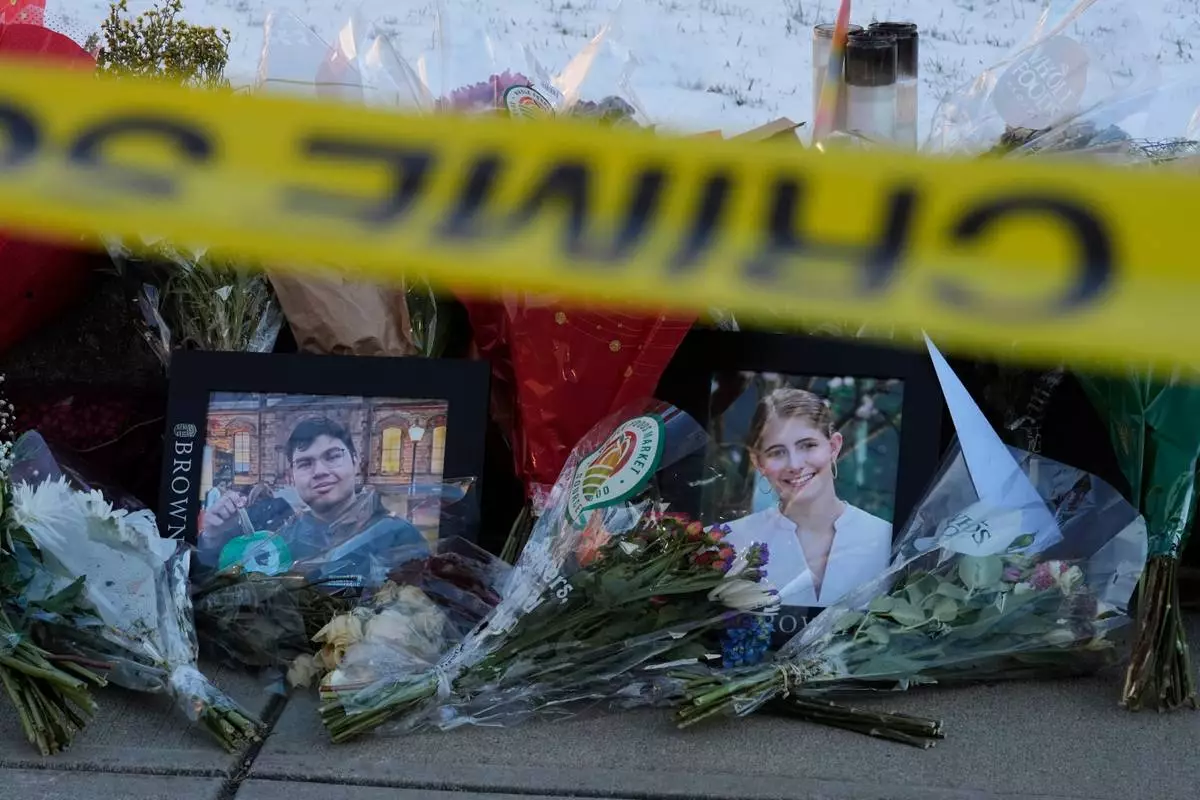 Photos of Brown University shooting victims Mukhammad Aziz Umurzokov, left, and Ella Cook, are seen amongst flowers at a makeshift memorial outside the Engineering Research Center, Tuesday, Dec. 16, 2025, in Providence, R.I.(AP Photo/Robert F. Bukaty)