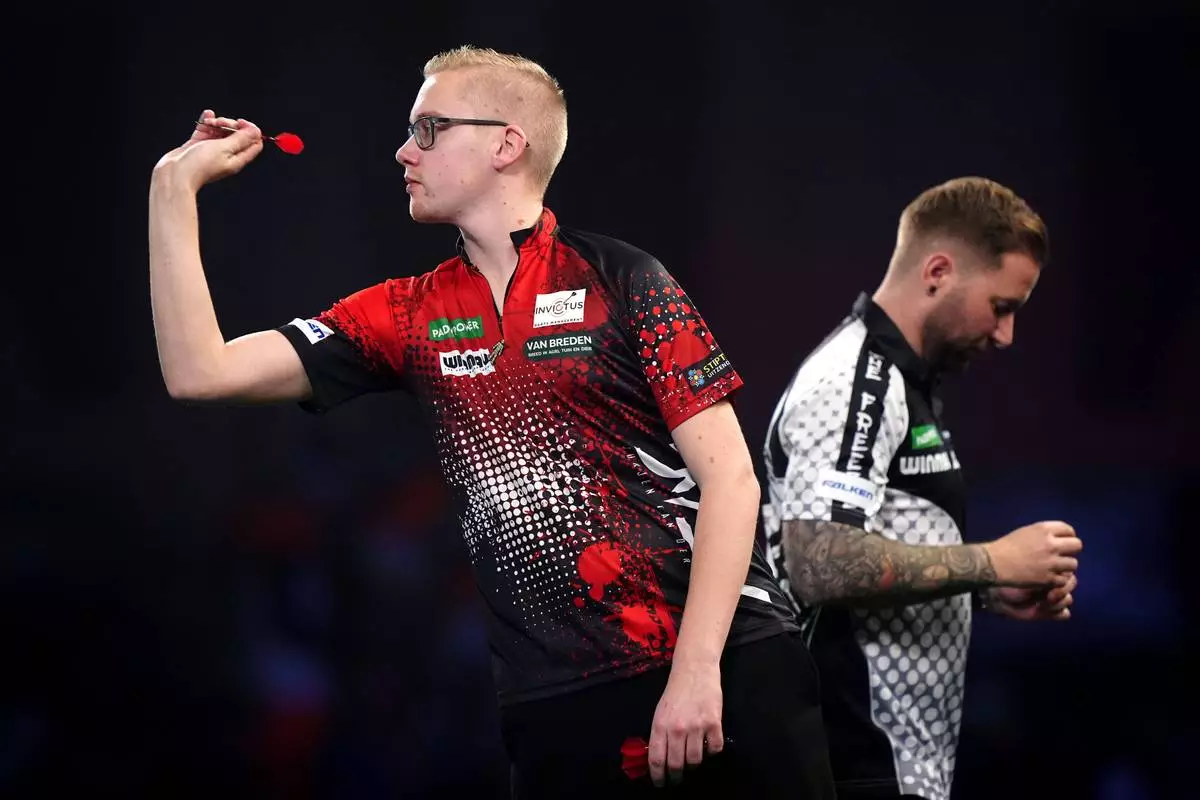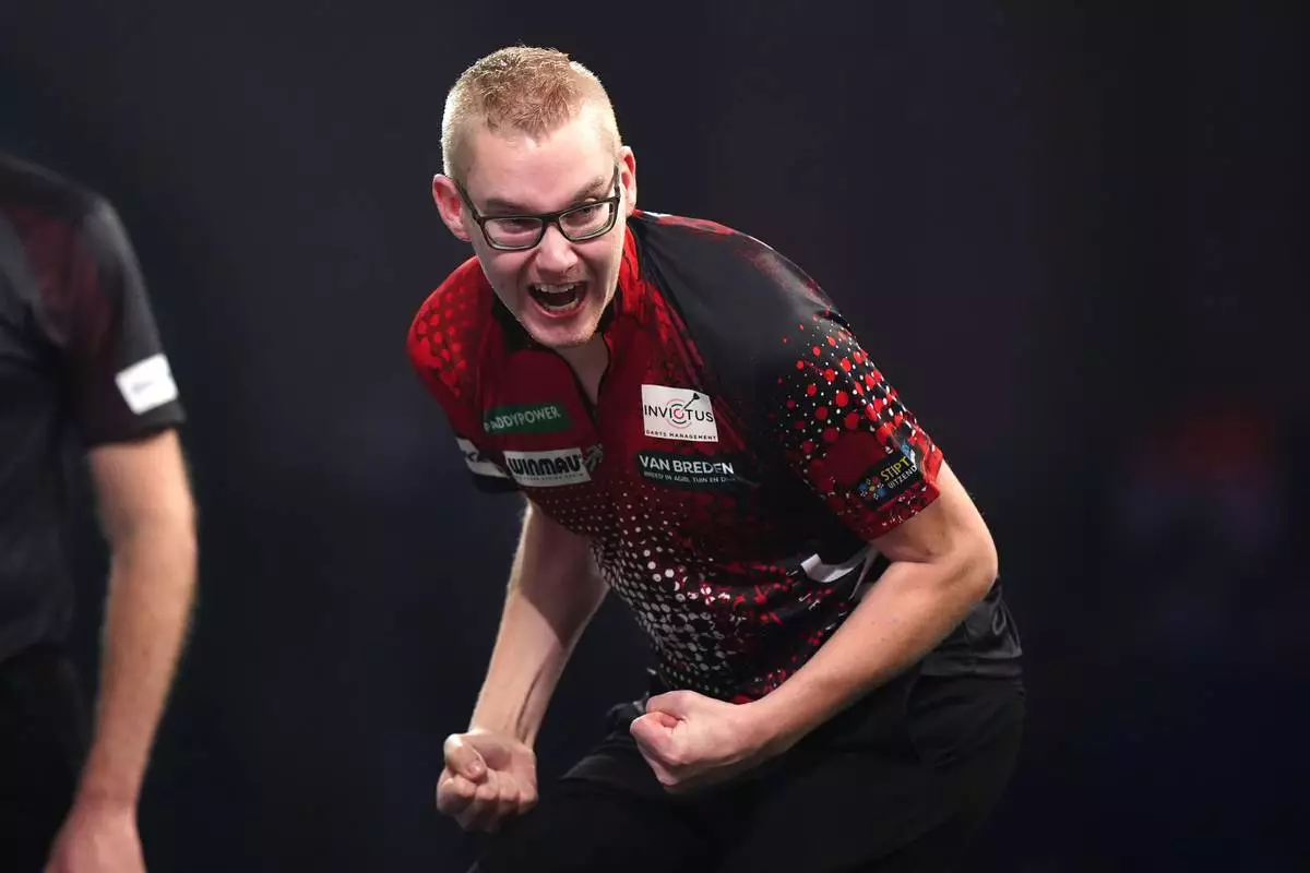Jurjen van der Velde reacts at the World Darts Championships, at Alexandra Palace, in London, England, Tuesday, Dec. 16, 2025. (Bradley Collyer/PA via AP)