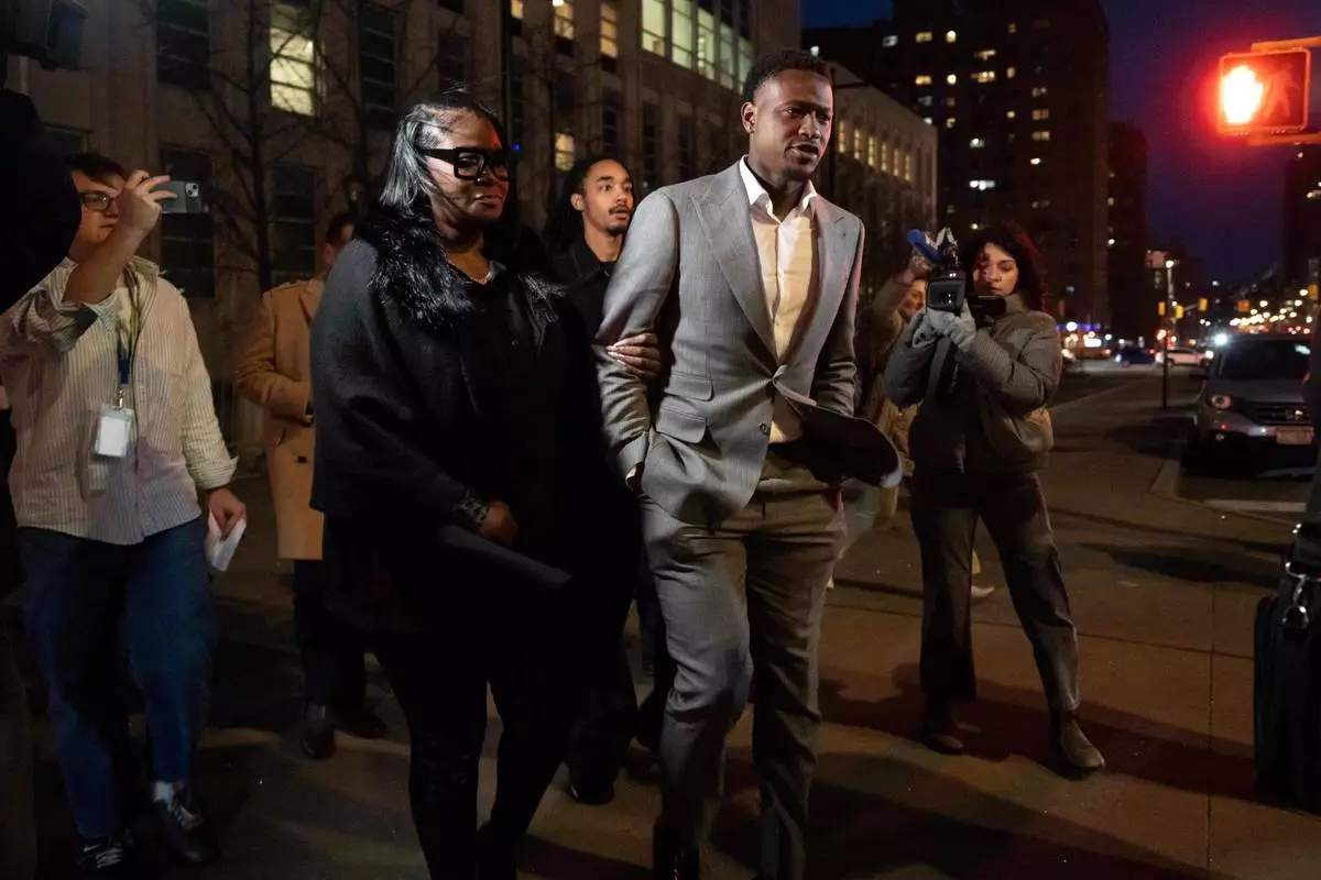Miami Heat's Terry Rozier, right, leaves Brooklyn federal court, Monday, Dec. 8, 2025, in New York. (AP Photo/Yuki Iwamura)