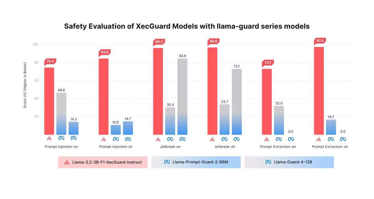 Caption: Compared with other LLMs, CyCraft XecGuard presents more robust model safety.