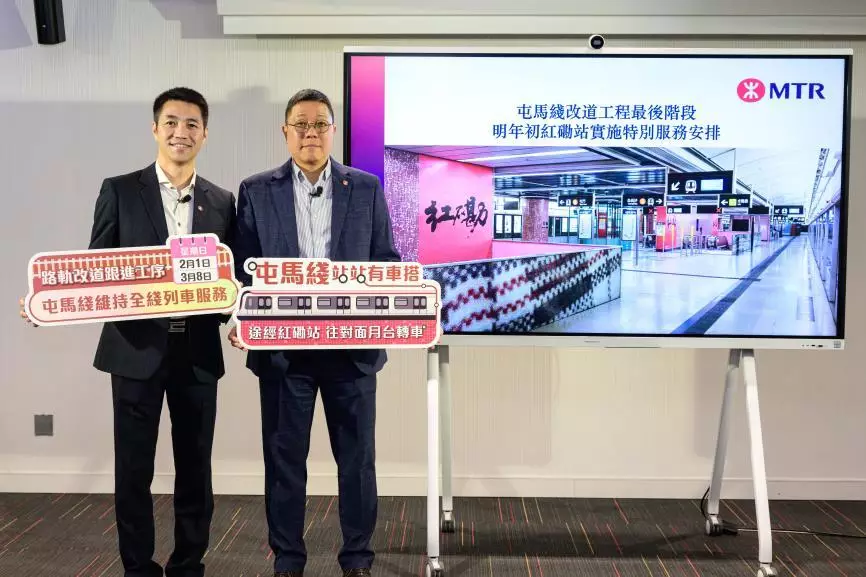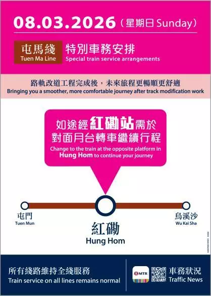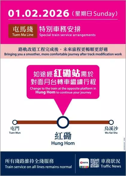 MTR Corporation announced today (17 December 2025) that special service arrangements will be implemented on the Tuen Ma Line on 1 February and 8 March 2026 (both Sundays), as temporary closure of certain sections of the track is required to facilitate follow-up works for the track modification between Hung Hom and East Tsim Sha Tsui stations on the Tuen Ma Line. During traffic hours on these two designated Sundays, full line train service on the Tuen Ma Line will be maintained and most passengers' journeys will remain unchanged. Only passengers whose journeys pass through Hung Hom Station will need to alight at the station and interchange at the opposite platform to continue their journeys. The Corporation will inform passengers of the arrangements through various channels and deploy additional staff to guide and assist passengers.