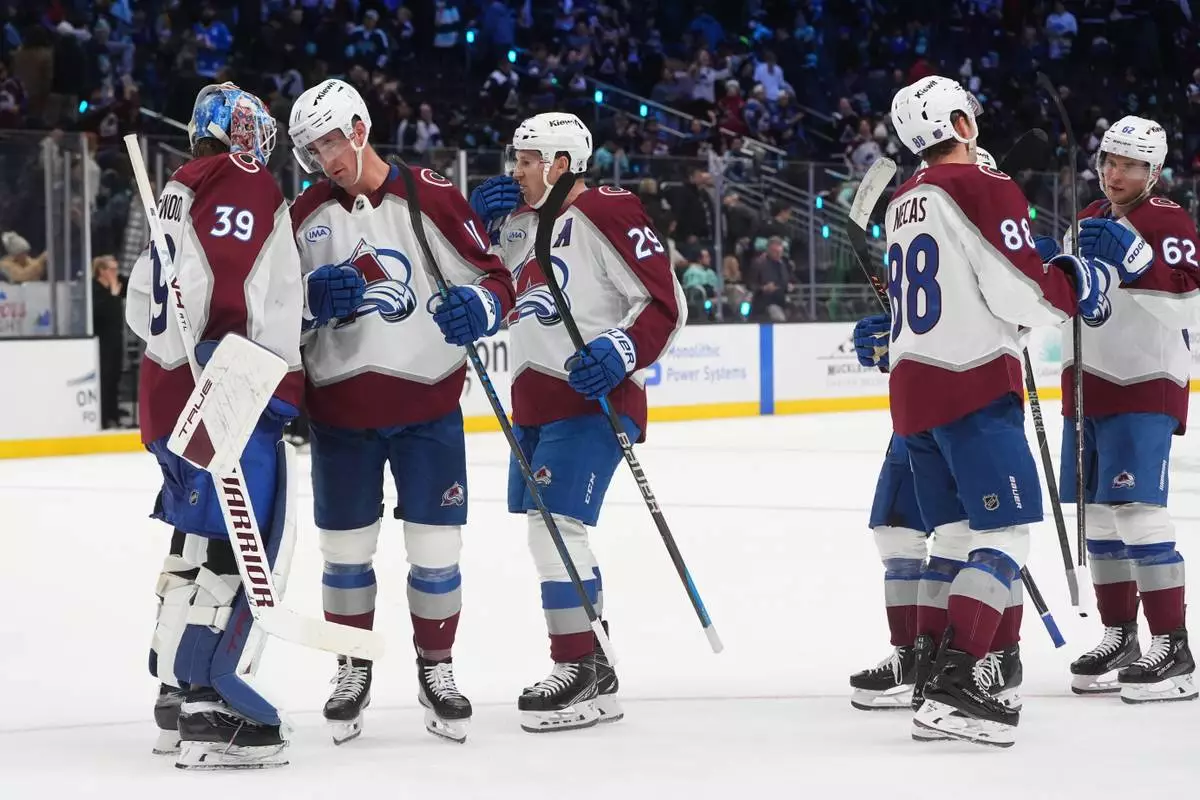 Colorado Avalanche goaltender Mackenzie Blackwood (39) celebrates a win against the Seattle Kraken with center Brock Nelson, second from left, and center Nathan MacKinnon, third from left, after of an NHL hockey game Tuesday, Dec. 16, 2025, in Seattle. (AP Photo/Lindsey Wasson)