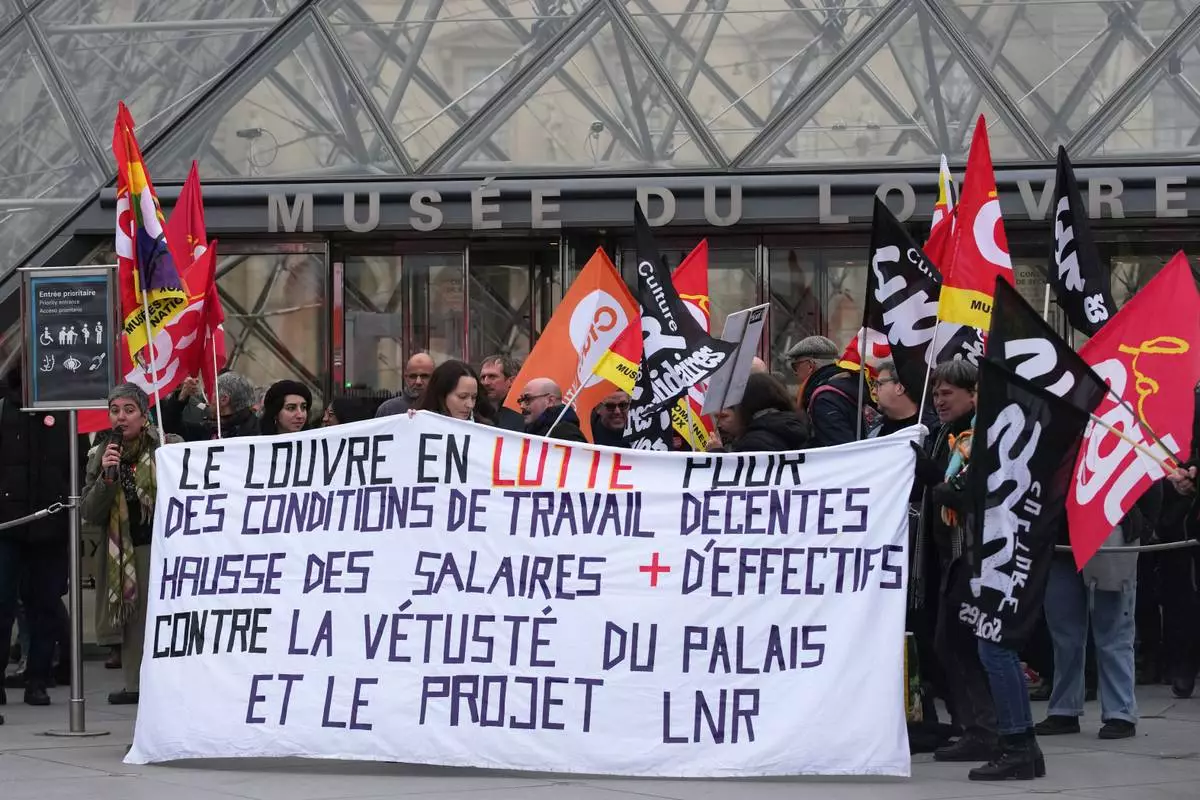Workers display a banner reading "Louvre on strike" outside the Louvre museum after they voted to strike for the day over working conditions and other complaints, Monday, Dec. 15, 2025 in Paris. (AP Photo/Michel Euler)
