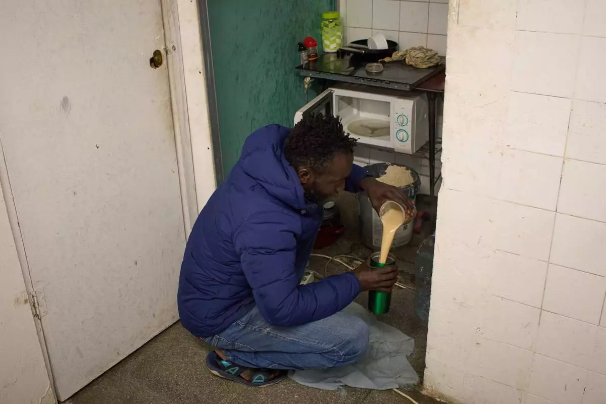 Yankuba Touray, from Gambia, eats his breakfast inside an abandoned school in Badalona, near Barcelona, Spain, Tuesday, Dec. 16, 2025, where hundreds of migrants have been occupying the building.(AP Photo/Emilio Morenatti)