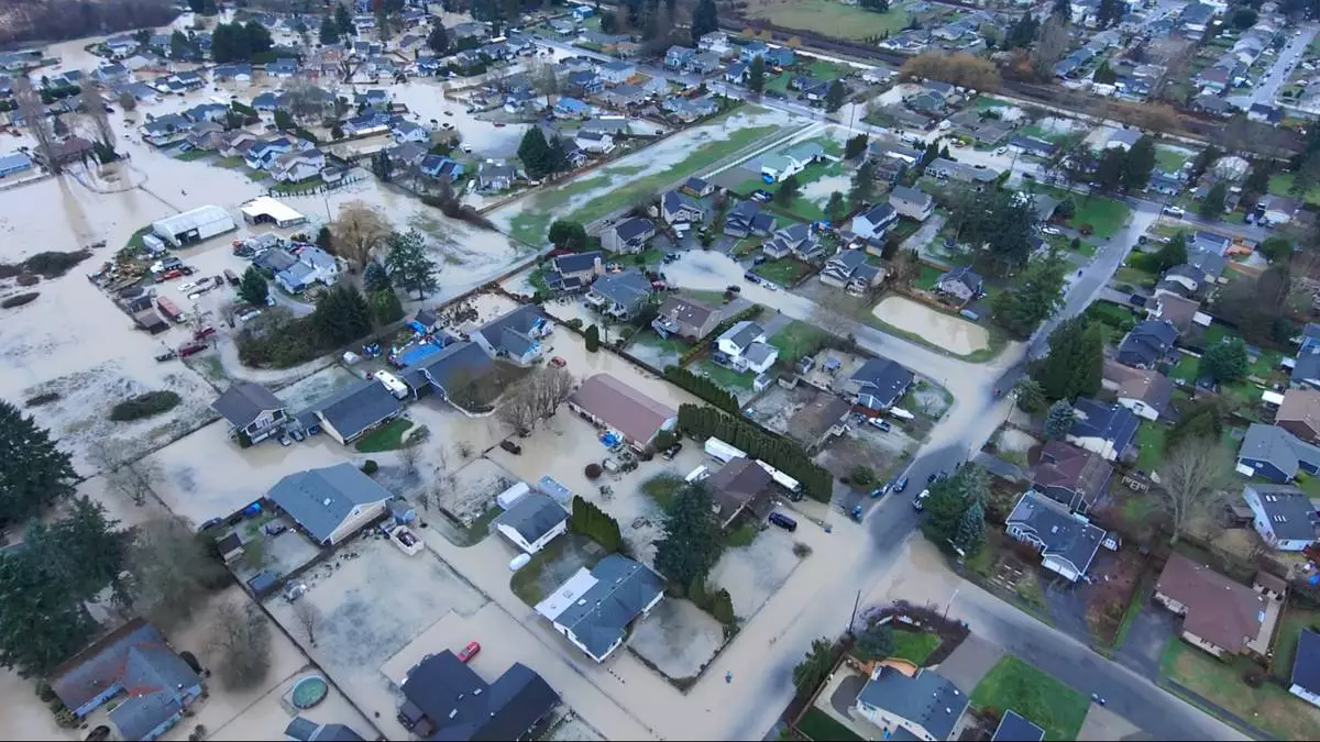 This image made from a video provided by the Pacific Police Department shows homes and buildings underwater, Tuesday, Dec. 16, 2025, in Pacific, Wash. (Pacific Police Department via AP)