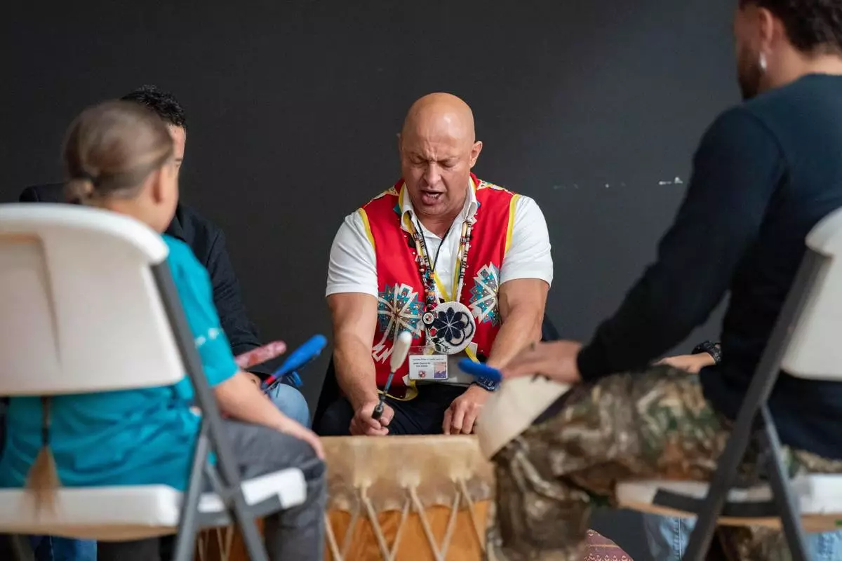 People sing while playing drums during a watch party hosted by the Lumbee Tribe of North Carolina, Wednesday, Dec. 17, 2025, in Pembroke, N.C. (AP Photo/Allison Joyce)