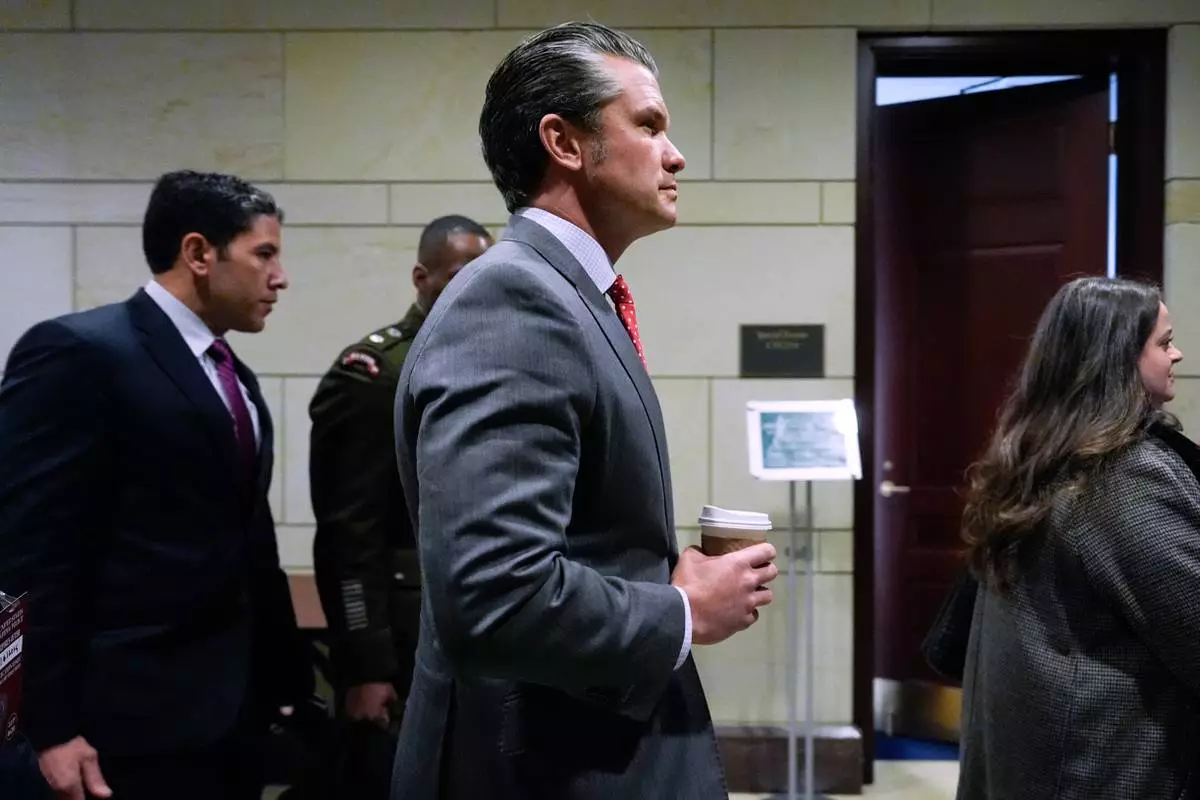 Defense Secretary Pete Hegseth arrives to brief members of Congress on military strikes near Venezuela, Tuesday, Dec. 16, 2025, at the Capitol in Washington. (AP Photo/Julia Demaree Nikhinson)