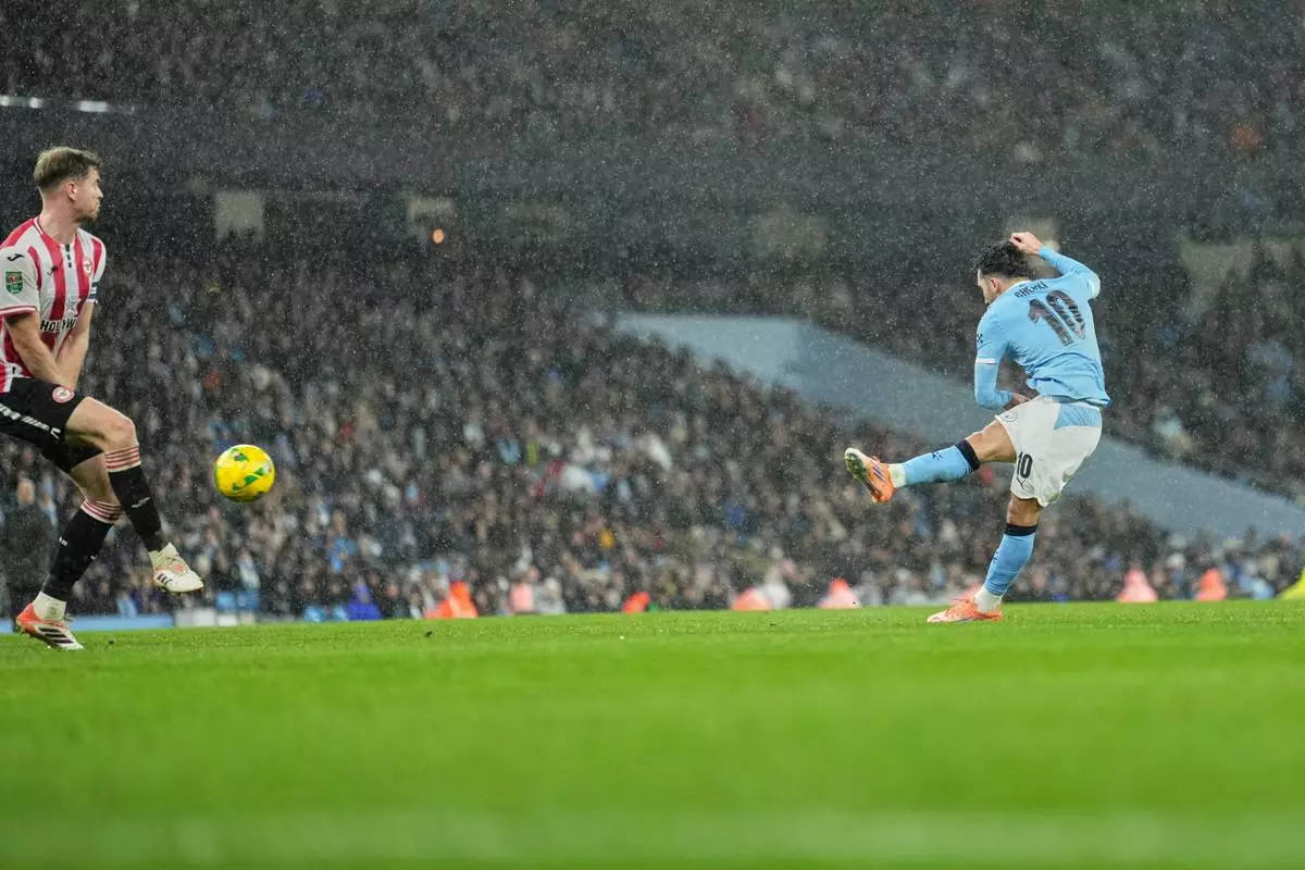 Manchester City's Rayan Cherki scores his side's first goal during the English League Cup soccer match between Manchester City and Brentford in Manchester, England, Wednesday, Dec. 17, 2025. (AP Photo/Jon Super)