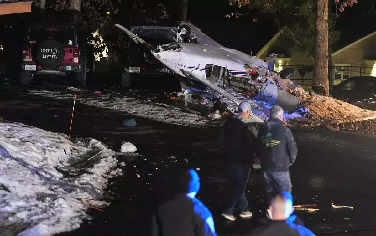 Airplane wreckage rests in a wooded neighborhood, Wednesday, Dec. 17, 2025, in Nashua, N.H. (AP Photo/Charles Krupa)